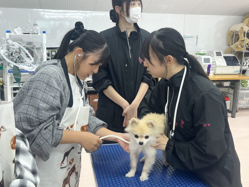 まずは動物看護体験今回の体験はバイタルチェックについて。愛玩動物看護科の学生がサポートしてくれます。バイタルチェックは基本です。参加者の皆さんは、教員の説明を聞きつつ、真剣な表情でした