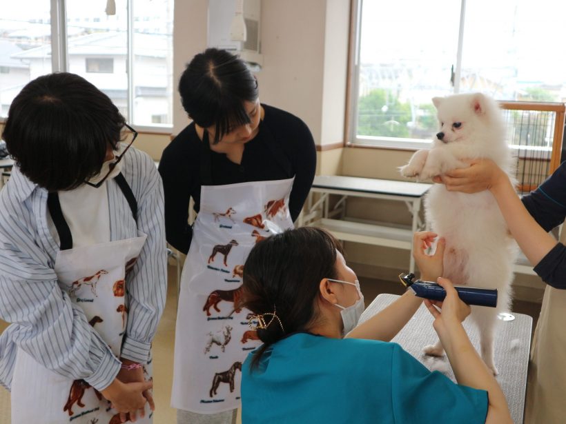 そしてトリミング体験。モデル犬のブラッシングや爪切り、耳掃除、足裏のバリカンなど、基本的なお手入れを体験します。
