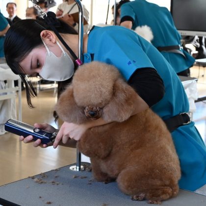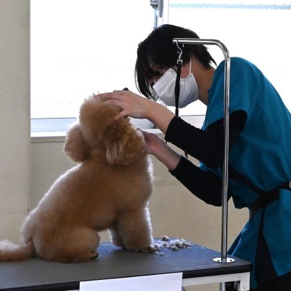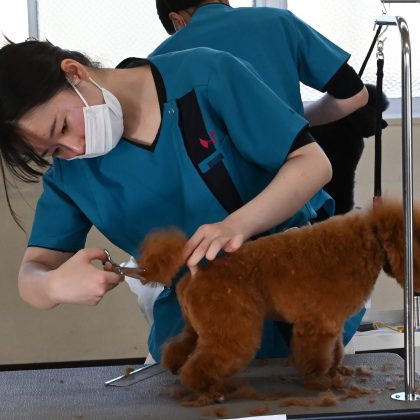 バリカンで毛を刈り取るクリッピングやシザーリング、犬の扱いなど各審査ポイントを踏まえながら、120分という限られた時間内で仕上げます。犬の気持ちに配慮しつつ、いかに美しく仕上げることが出来るかも大きなポイントとなります。仲間や後輩たちが観覧する中、それぞれが持てる力を存分に発揮しました![]()