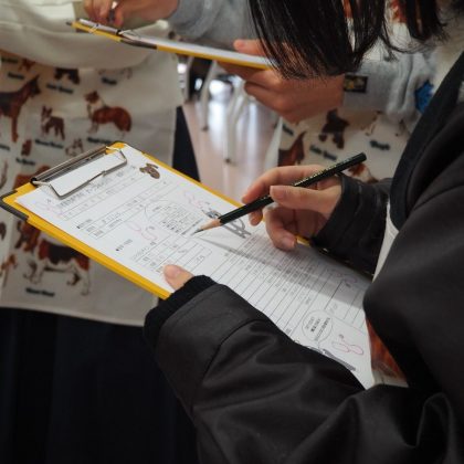 先生の指示のもと、学生スタッフと一緒にモデル犬の脈拍や心拍を測るなど様々な体験を行いました。