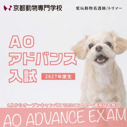 みんなの授業参観日!! お知らせ学校の様子学生生活 2026.01.17. 2027年度生のためのAOエントリー資格発行! お知らせ体験入学会 2026.01.11. 本日1月5日より業務再開です。 お知らせ体験入学会 2026.01.05. 新年あけましておめでとうございます。 お知らせ 2026.01.01. 冬期休業について お知らせ 2025.12.23. 京都動物愛護センターへ物品を寄贈してきました。 未分類 2025.12.16. 第20回校内トリミング競技会 学校の様子学生生活 2025.12.05. オープンキャンパスを開催しました! 体験入学会 2025.12.01. NAVAトリマーライセンス2級実技試験 学校の様子学生生活 2025.11.28. 京都鉄道博物館にブース出展しました 学校の様子学生生活 2025.11.27.