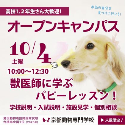 【10/4開催】初めてのオープンキャンパスにお越しください! お知らせ体験入学会 2025.09.25. 初めてならお早めに!オープンキャンパスのお知らせ お知らせ体験入学会 2025.09.01. 【オープンキャンパス】動物看護&トリミング体験を開催しました! お知らせ体験入学会 2025.08.25. 創立50周年 記念募金のお願い お知らせ 2025.08.13. 夏季休業と入学相談会について お知らせ体験入学会 2025.08.07. 本日8/1より、AOアドバンス入試第3期エントリー受付開始! お知らせ体験入学会 2025.08.01. AOアドバンス入試 第3期受付について お知らせ体験入学会 2025.07.23. 8月9日・8月23日のオープンキャンパスは満席となりました。 お知らせ体験入学会 2025.07.18. グルーミング実習Ⅱの授業風景をご紹介します! お知らせ体験入学会学校の様子学生生活 2025.07.08. 【グルーミング学科】AOアドバンス入試 第2期実施について(2025.7.4) お知らせ 2025.07.05.